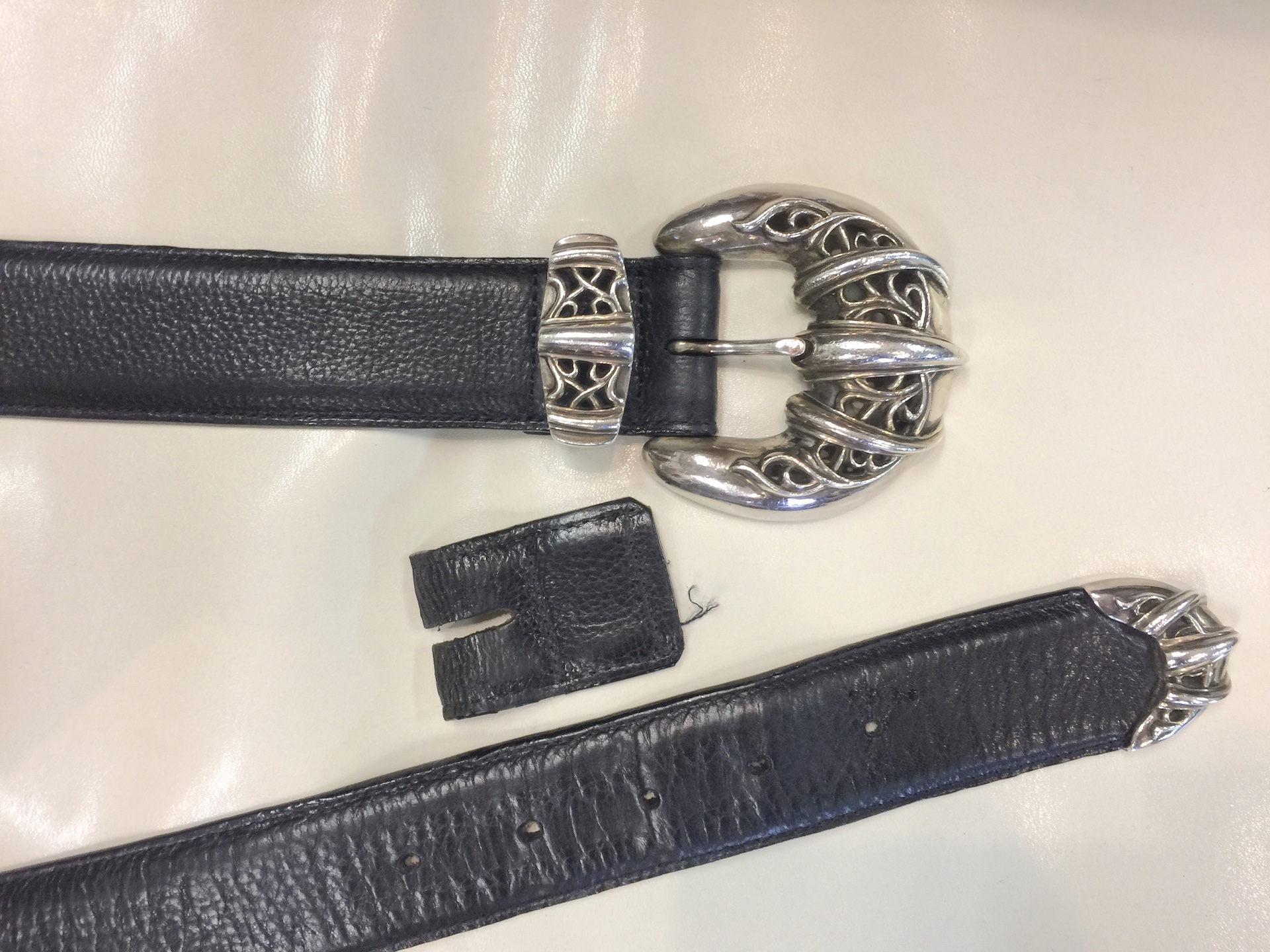 当店では、革ベルトのサイズ直し(3ローラーその他)などは、切断箇所が目立たぬようすべてバックル側で切断加工し、オリジナルと同じ加工方法で厚み調整&手縫い縫製にて仕上げております。 クロムハーツの修理事例を見る