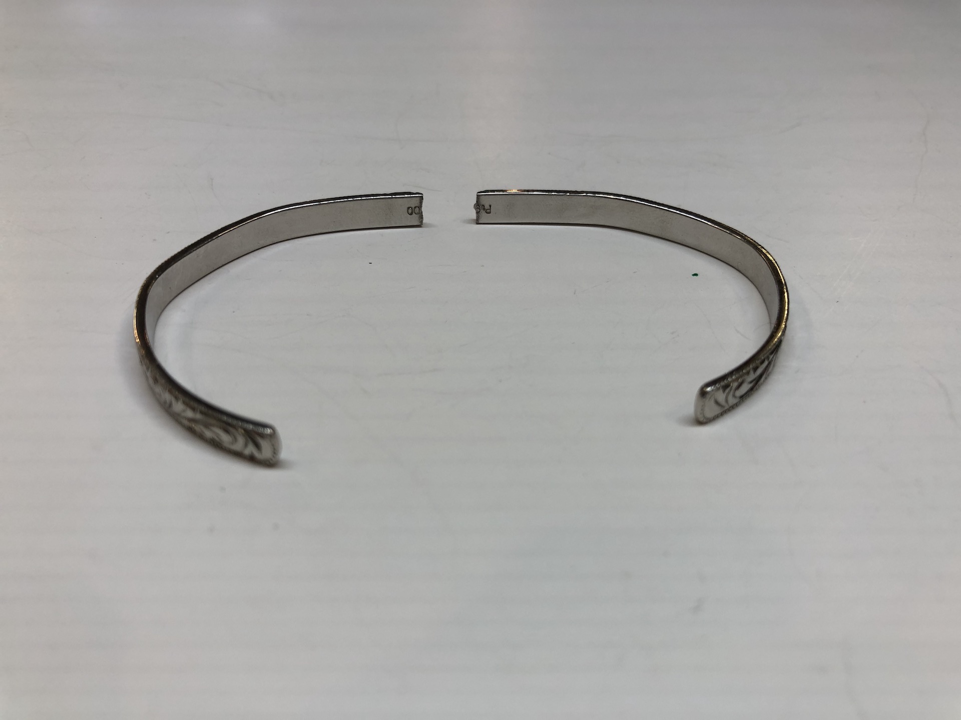 50年以上加工をしていると、色々なジャンルの修理&加工依頼が有ります。この画像はプラチナハワイジュエリーのバングルが折れた修理です。問題なく破断部分の修復加工と、表の彫りの再現などと、折れたセンター部分が特に薄い為強度を維持するため、一部にプラチナの板で補強しました。