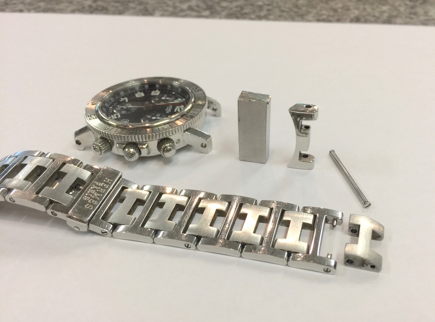 最近とても多いのが、弓カンの製作です。時計用の特殊な硬いステンレスの塊を、100分の5ミリ以内の誤差で削り出して製作しております。入手不可能なパーツ類を、時計本体とベルトのデザインを参考にして図面を引いて手作りで製作致します。ベルトのコマも製作いたします、コマは見えないシャフトやネジなどの多数のパーツの集合体ですので、難しい作業になりますので、まずは画像をメールでお送り頂ければ加工の難易度が判りますので、よろしくお願い致します。 時計関連の修理事例を見る
