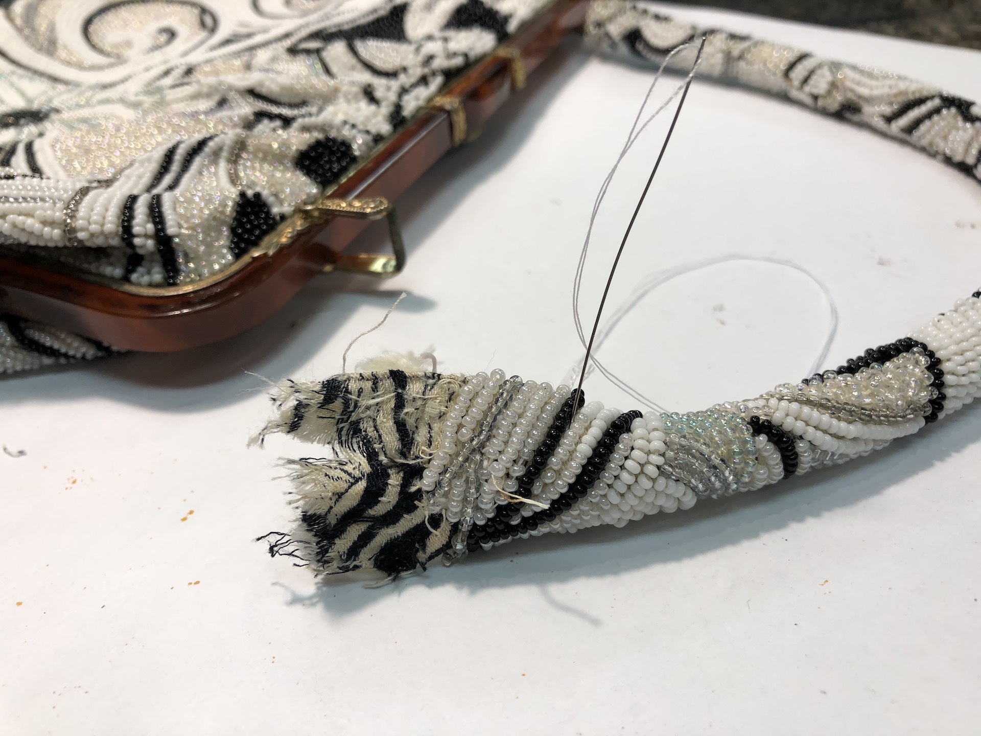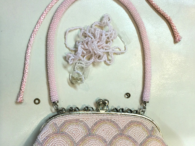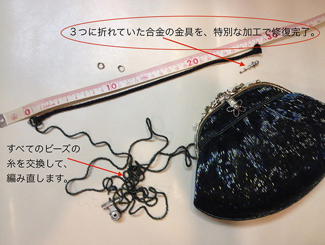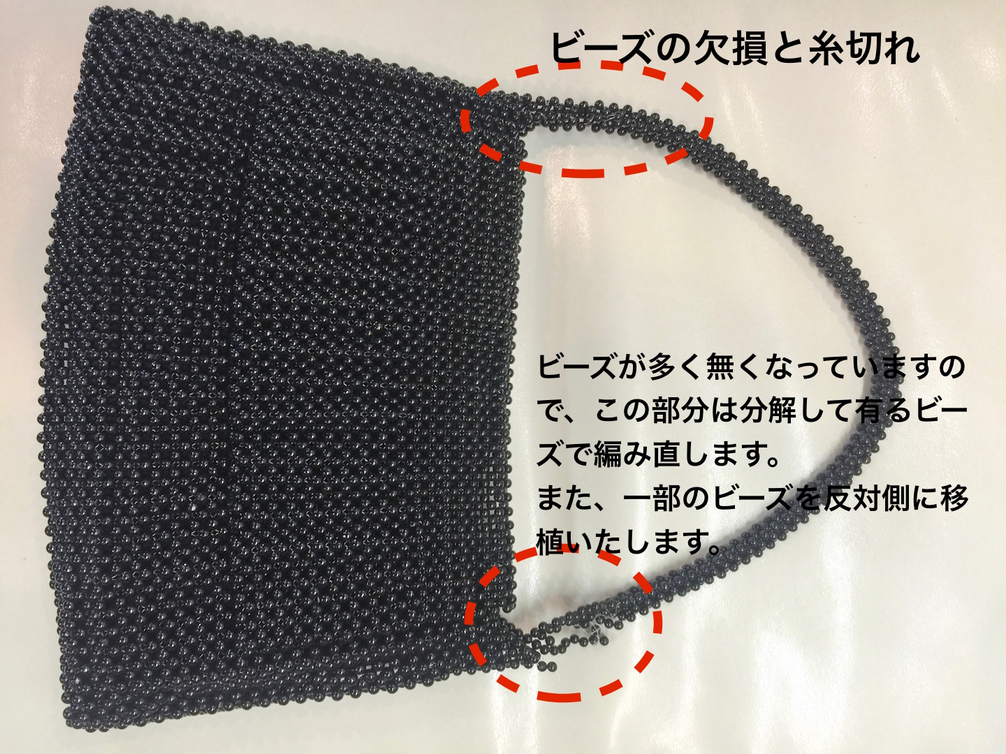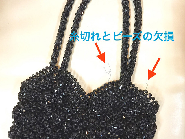 バック本体に繋がる合金の金具が折れ、糸も切れてビーズが一部失くなった状態でした。