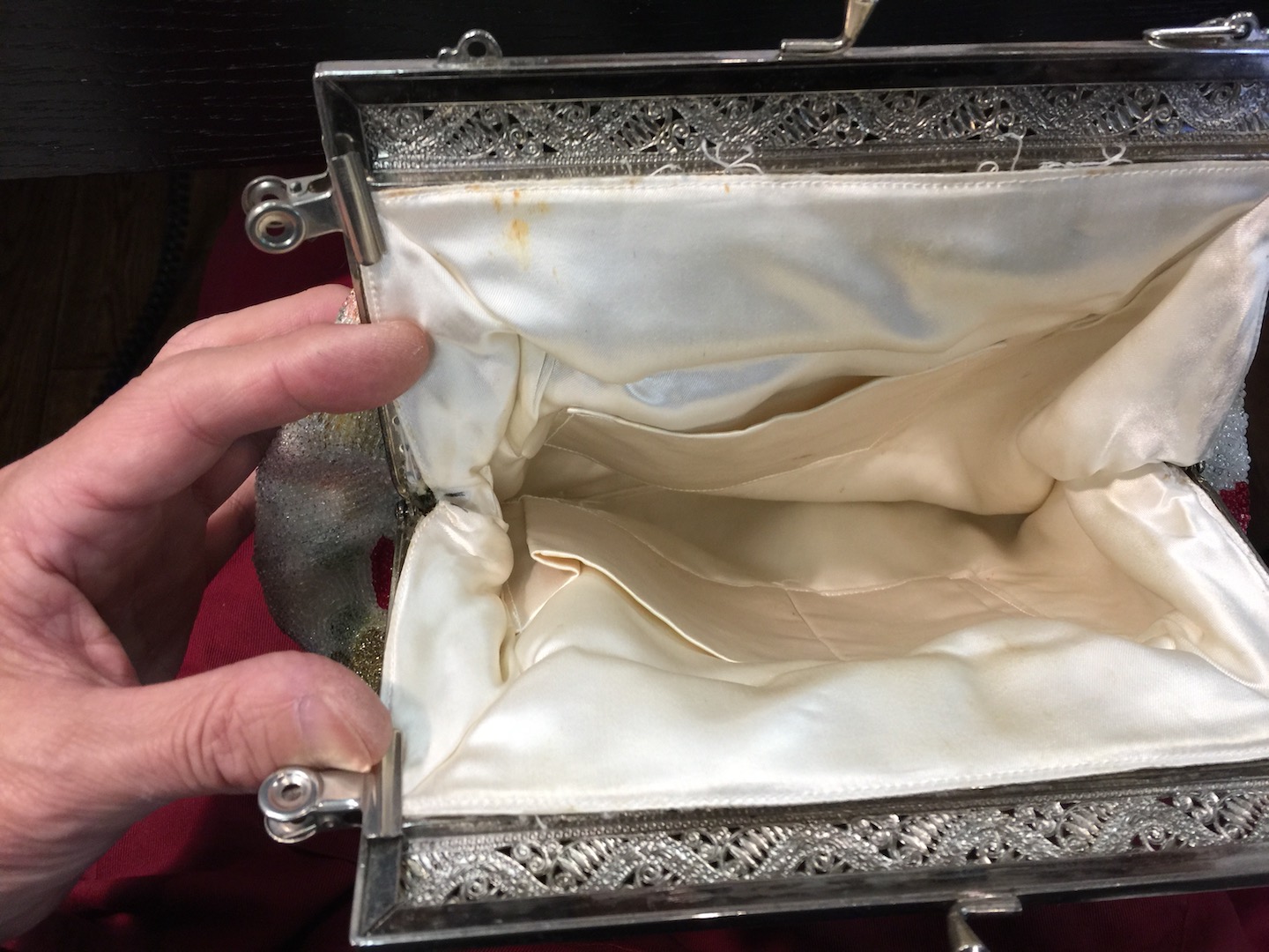 口金の布にビーズが固定されており、その布も傷んで切れている。内布も古く劣化して切れている状態でした。