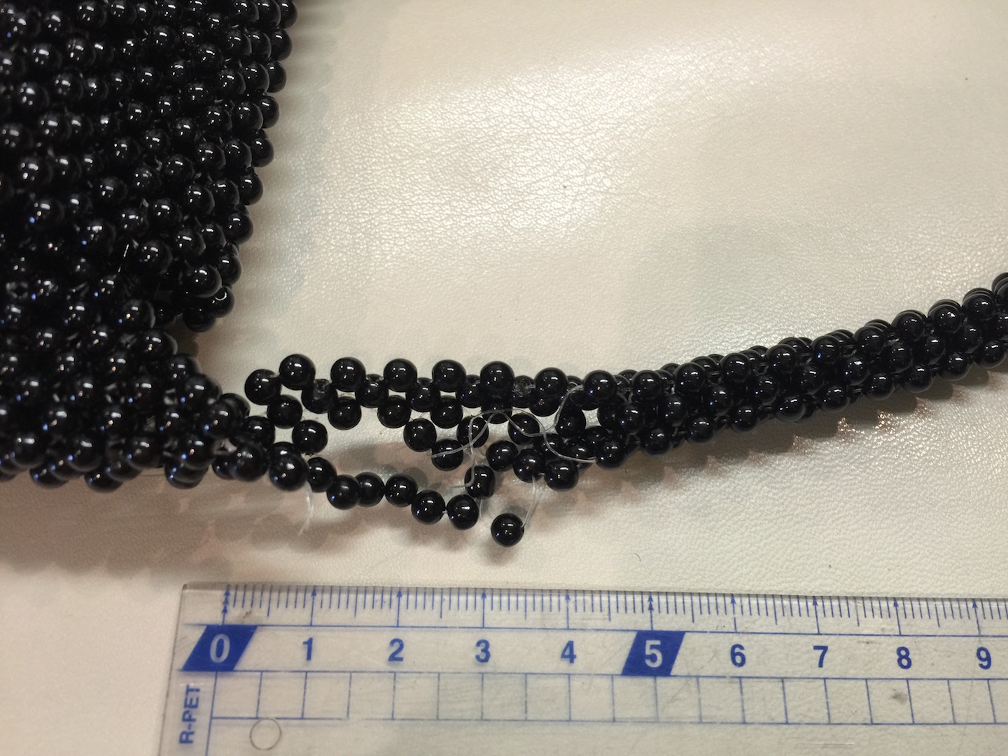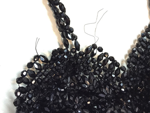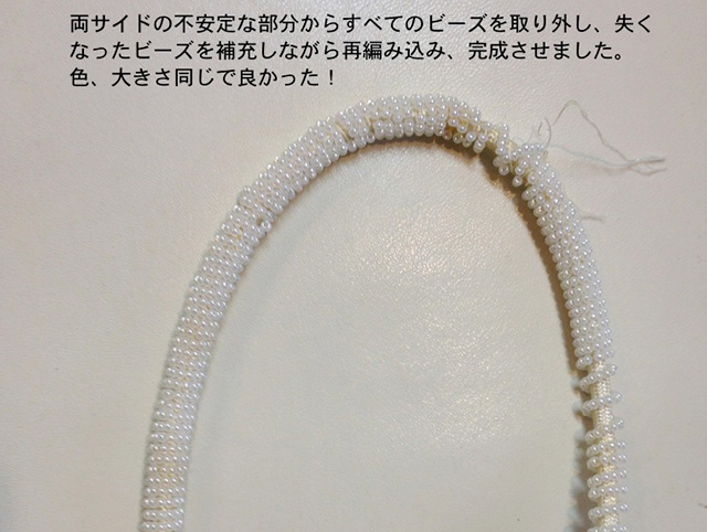 大きく切れてビーズも欠損している場所は、残っている糸を切りビーズをバラバラに分解して、新しい糸で編み直す加工になりました。