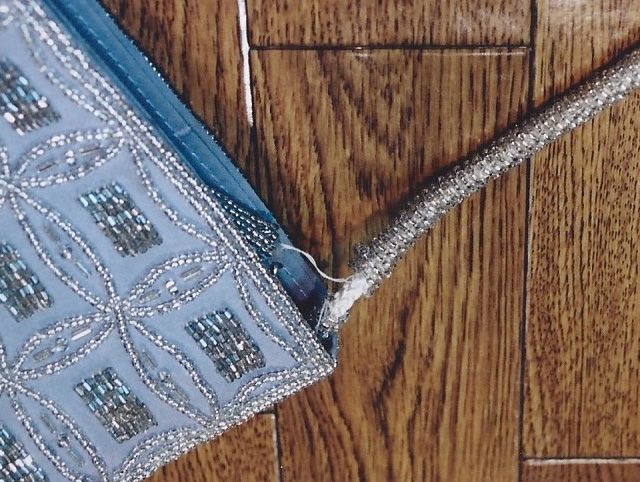 修復が完成した部分を、金具に巻いて正確にビーズ列を合わせながら、縫製固定完了です。