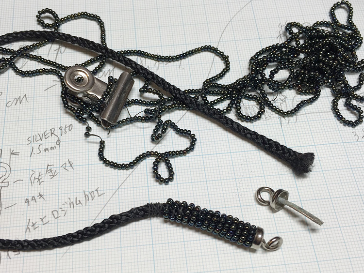 この状態のビーズの修理は不可能ですので、同じビーズを調達して持ち手を作り直す作業になります。最近、この同じビーズが手に入らなくなり、これは全てのビーズを交換する為、今回は0.5mmほど小さいビーズを見つけて約2200個以上集める。持ち手の両端の金具も製作して、芯も作りオリジナルと同じ様に巻き直しました。