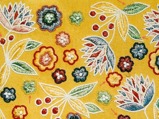 目を凝らすと、いろいろなデザイン部分のビーズが無くなっていました。葉のデザイン部分や、花びらの中心部分などのビーズ欠損です。無くなっていたビーズのほとんどの種類は、偶然私が集めていた在庫分で仕上げる事が出来ました。