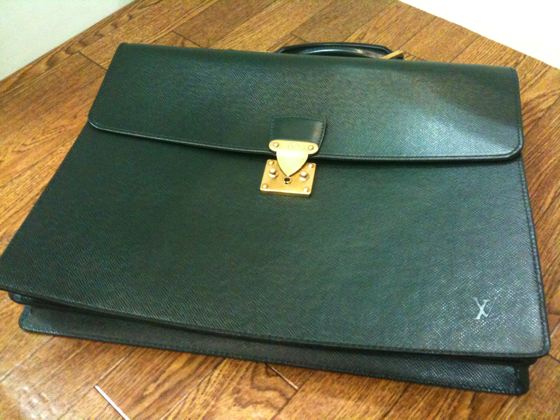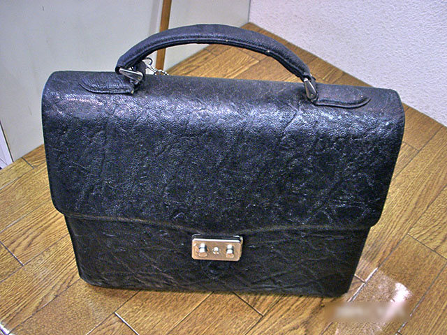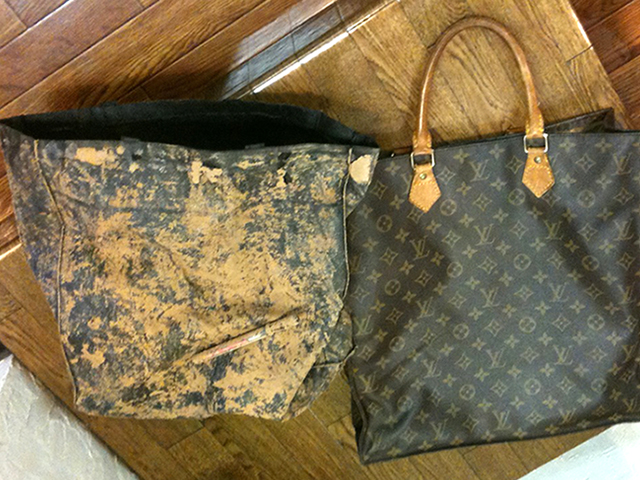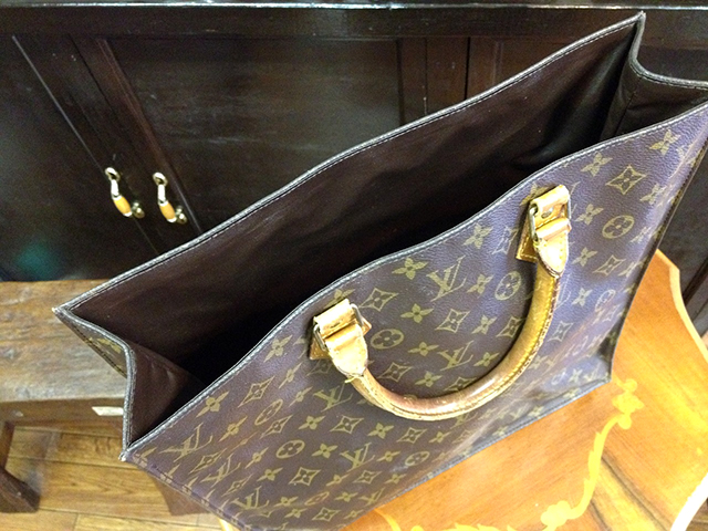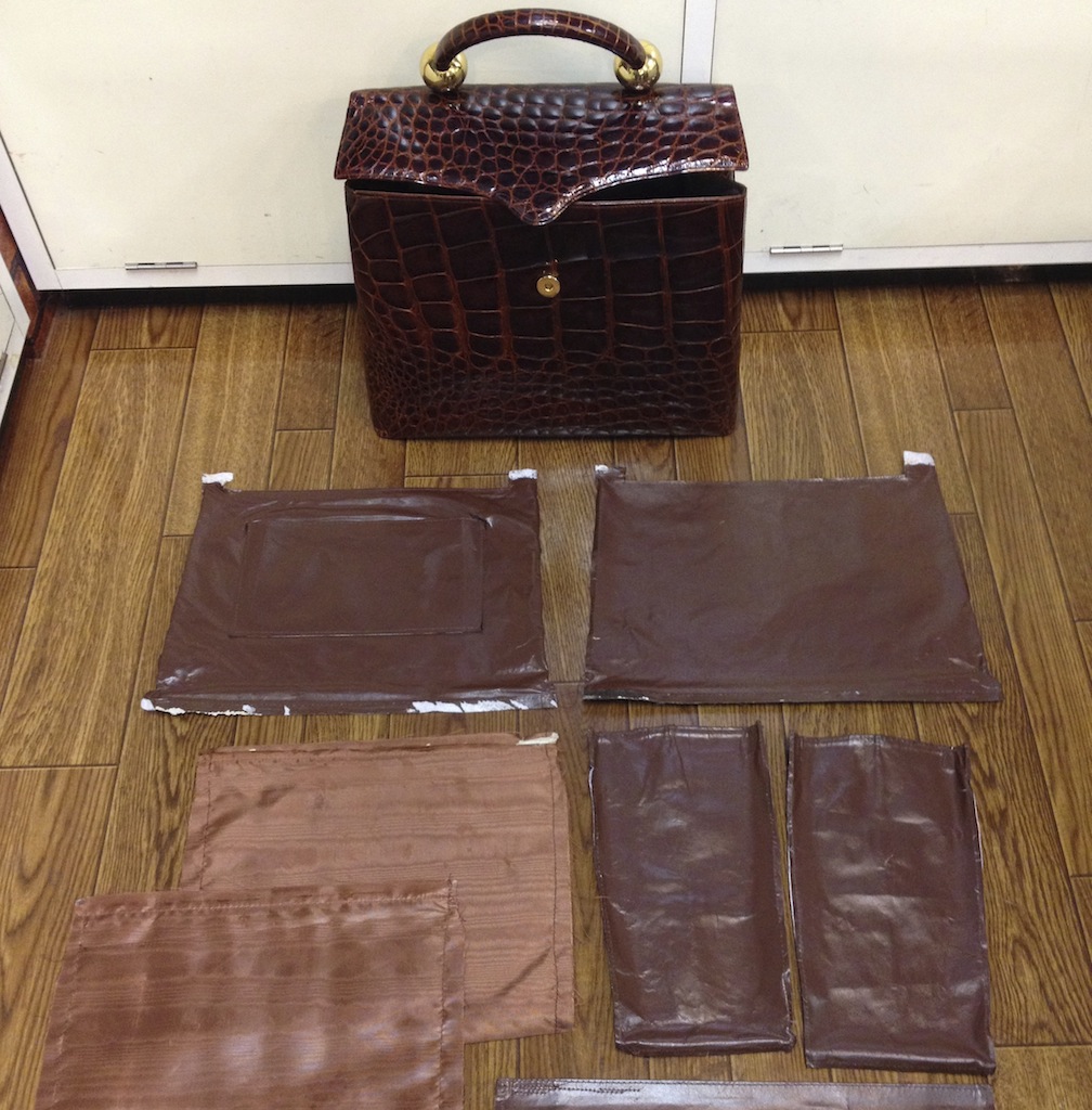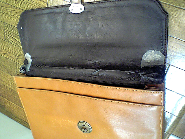 お客様が内張りの破損を隠す為に、そのサイズに合うナイロンバッグを入れた事で、とんでもない状態に!! バッグと接着剤を剥離するのに数日かかりました。 内側のサイズを計測し、サービスでポケット一つ作る為の全体の型紙製作。 接着剤がどうしても剥離出来ない部分が有り、縫製は別の方法で内張りを固定。 みごとベトベトしていた接着剤の痕は、内布で隠せる事が出来ました。 最後に外側の痛んでいる部分の補強修理、さらに磨きクリーニングをしてお渡しました。
