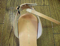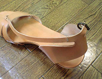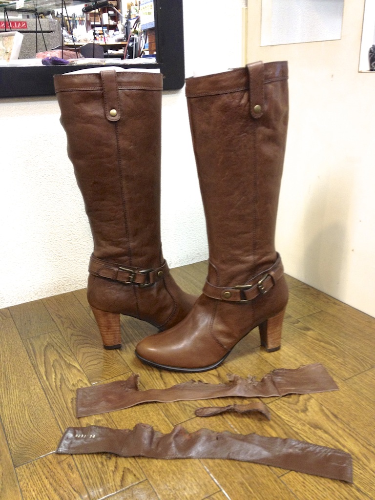 あわてて履こうとして片足が破れてしまったそうです。 皮革を交換ではなく縫製のご依頼でした。 後ろの踵の皮も破れていたので一部を分解し、内部から縫製をする部分の加工もありそうですが、今回は縫い目もデザインだ!という事で規則正しく手縫いで3層の皮革を完成させました。 内側は、着脱がしやすい様に同色の皮が当店在庫の中に有りましたので、貼っております。